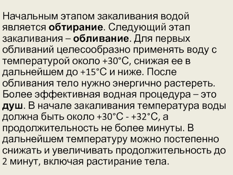 Начальным этапом закаливания водой является обтирание. Следующий этап закаливания – обливание. Для первых обливаний целесообразно применять воду с температурой около +30°С, снижая ее в дальнейшем до +15°С и ниже. После обливания тело нужно энергично растереть. Более эффективная водная процедура – это душ. В начале закаливания температура воды должна быть около +30°С - +32°С, а продолжительность не более минуты. В дальнейшем температуру можно постепенно снижать и увеличивать продолжительность до 2 минут, включая растирание тела.