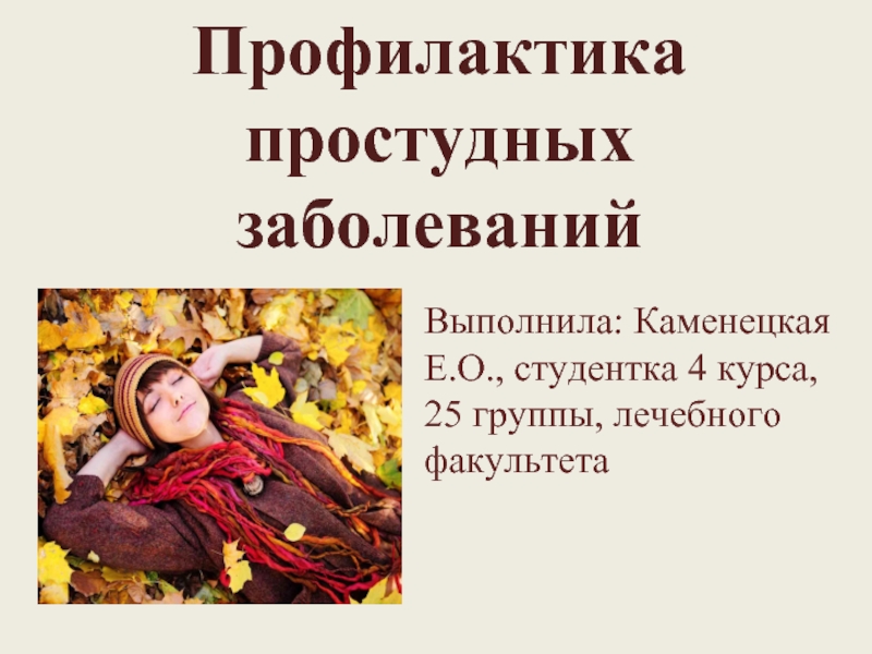 Презентация на тему Презентация на тему Профилактика простудных заболеваний, предмет презентации: Медицина. Этот материал содержит 26 слайдов. Красочные слайды и илюстрации помогут Вам заинтересовать свою аудиторию. Для просмотра воспользуйтесь проигрывателем, если материал оказался полезным для Вас - поделитесь им с друзьями с помощью социальных кнопок и добавьте наш сайт презентаций ThePresentation.ru в закладки!