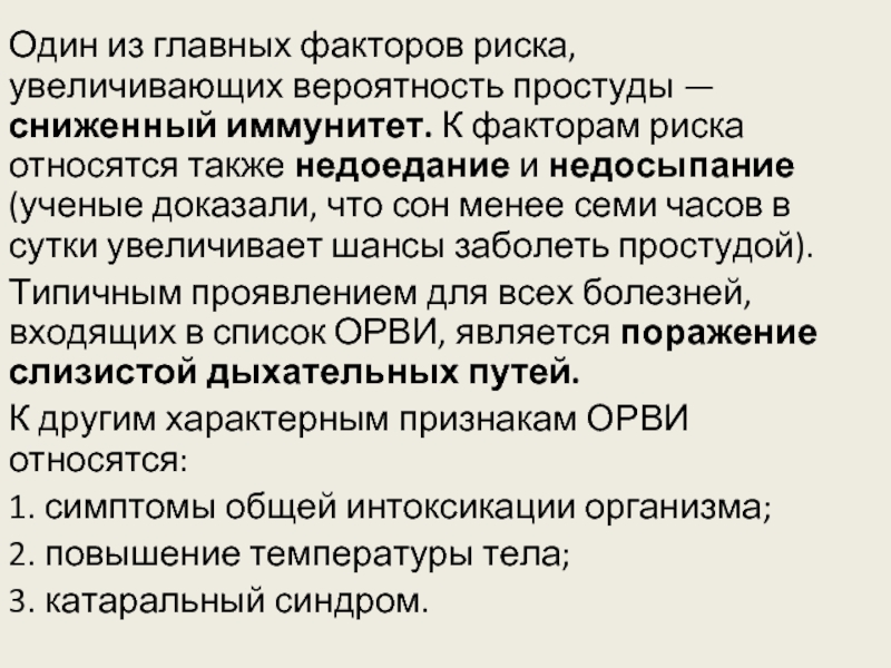 Один из главных факторов риска, увеличивающих вероятность простуды — сниженный иммунитет. К факторам риска относятся также недоедание и недосыпание (ученые доказали, что сон менее семи часов в сутки увеличивает шансы заболеть простудой).
