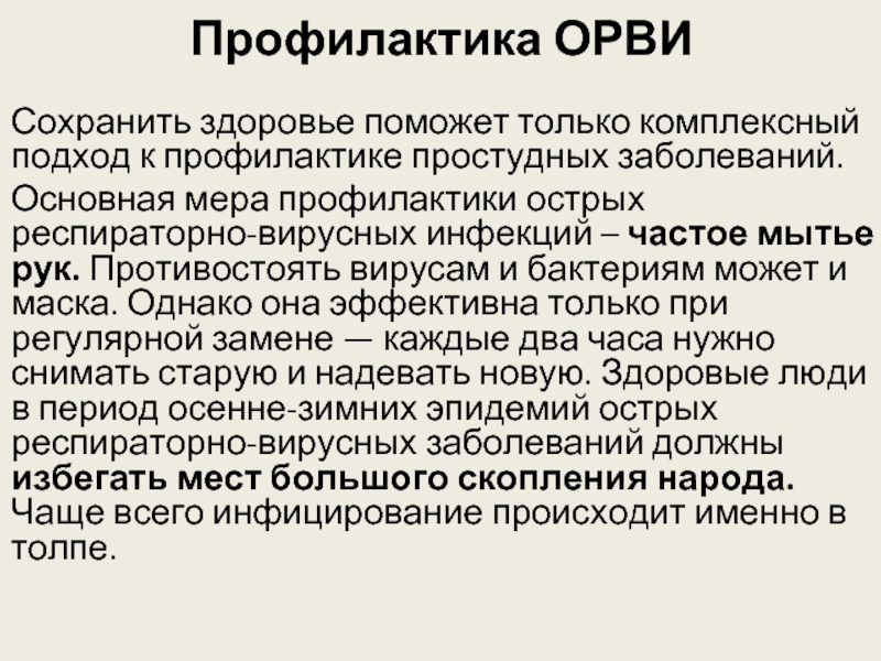 Основная мера профилактики острых респираторно-вирусных инфекций – частое мытье рук. Противостоять вирусам и бактериям может и маска. Однако она эффективна только при регулярной замене — каждые два часа нужно снимать старую и надевать новую. Здоровые люди в период осенне-зимних эпидемий острых респираторно-вирусных заболеваний должны избегать мест большого скопления народа. Чаще всего инфицирование происходит именно в толпе.