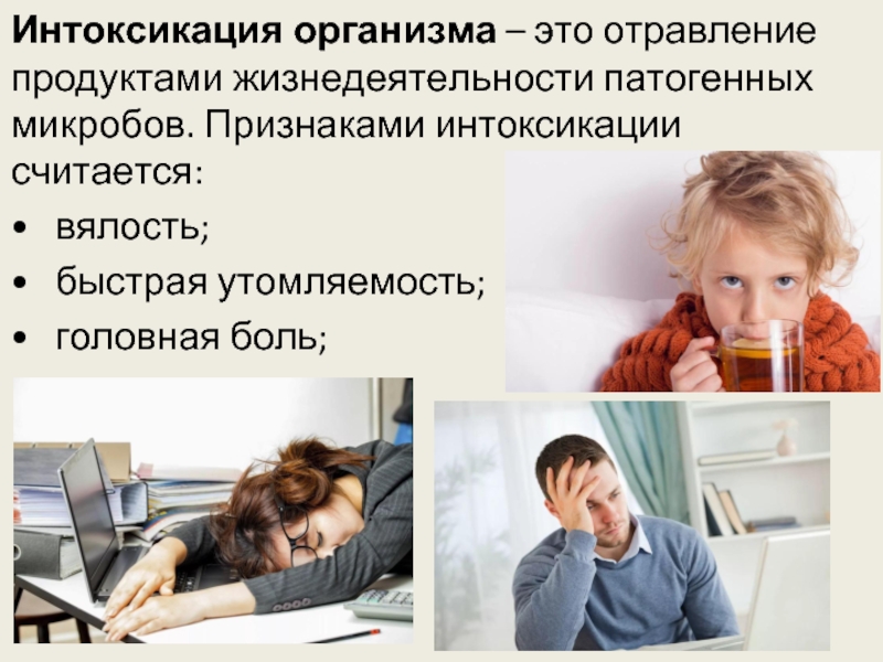Интоксикация организма – это отравление продуктами жизнедеятельности патогенных микробов. Признаками интоксикации считается: