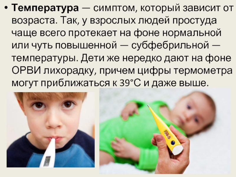 Температура — симптом, который зависит от возраста. Так, у взрослых людей простуда чаще всего протекает на фоне нормальной или чуть повышенной — субфебрильной — температуры. Дети же нередко дают на фоне ОРВИ лихорадку, причем цифры термометра могут приближаться к 39°С и даже выше.