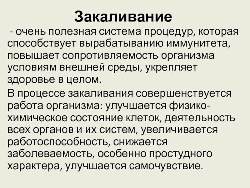 В процессе закаливания совершенствуется работа организма: улучшается физико-химическое состояние клеток, деятельность всех органов и их систем, увеличивается работоспособность, снижается заболеваемость, особенно простудного характера, улучшается самочувствие.