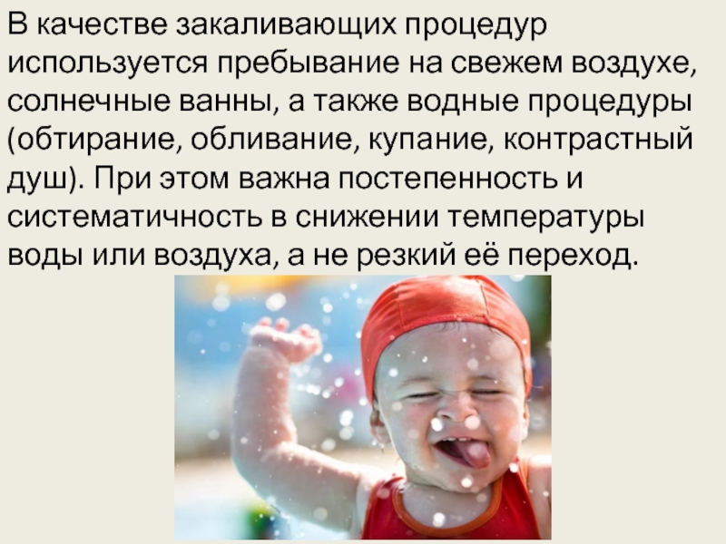 - очень полезная система процедур, которая способствует вырабатыванию иммунитета, повышает сопротивляемость организма условиям внешней среды, укрепляет здоровье в целом.