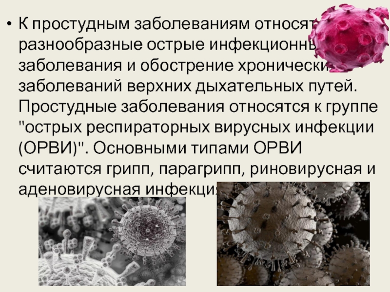 К простудным заболеваниям относят разнообразные острые инфекционные заболевания и обострение хронических заболеваний верхних дыхательных путей. Простудные заболевания относятся к группе "острых респираторных вирусных инфекции (ОРВИ)". Основными типами ОРВИ считаются грипп, парагрипп, риновирусная и аденовирусная инфекция.