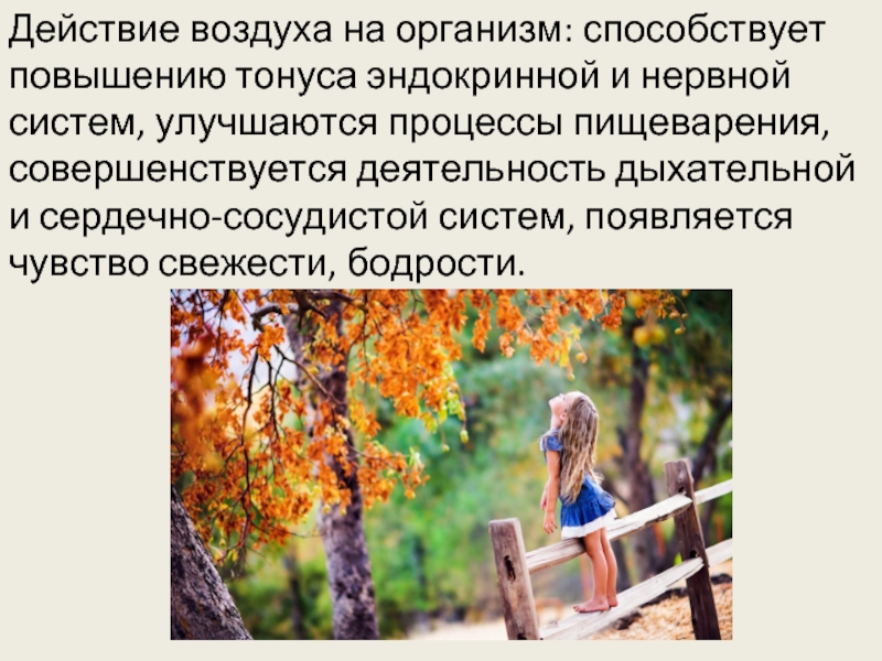 Действие воздуха на организм: способствует повышению тонуса эндокринной и нервной систем, улучшаются процессы пищеварения, совершенствуется деятельность дыхательной и сердечно-сосудистой систем, появляется чувство свежести, бодрости.