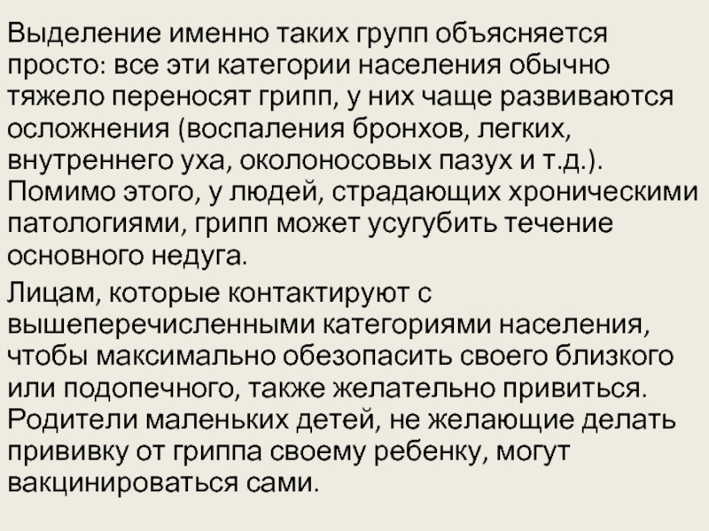 Выделение именно таких групп объясняется просто: все эти категории населения обычно тяжело переносят грипп, у них чаще развиваются осложнения (воспаления бронхов, легких, внутреннего уха, околоносовых пазух и т.д.). Помимо этого, у людей, страдающих хроническими патологиями, грипп может усугубить течение основного недуга.