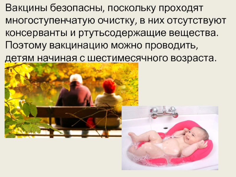 Вакцины безопасны, поскольку проходят многоступенчатую очистку, в них отсутствуют консерванты и ртутьсодержащие вещества. Поэтому вакцинацию можно проводить, детям начиная с шестимесячного возраста.