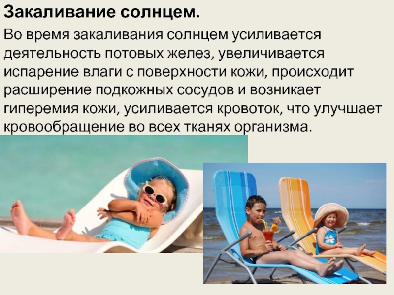 Во время закаливания солнцем усиливается деятельность потовых желез, увеличивается испарение влаги с поверхности кожи, происходит расширение подкожных сосудов и возникает гиперемия кожи, усиливается кровоток, что улучшает кровообращение во всех тканях организма.