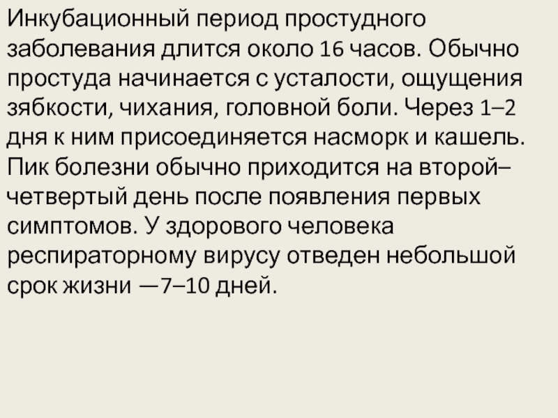 Инкубационный период простудного заболевания длится около 16 часов. Обычно простуда начинается с усталости, ощущения зябкости, чихания, головной боли. Через 1–2 дня к ним присоединяется насморк и кашель. Пик болезни обычно приходится на второй–четвертый день после появления первых симптомов. У здорового человека респираторному вирусу отведен небольшой срок жизни —7–10 дней.