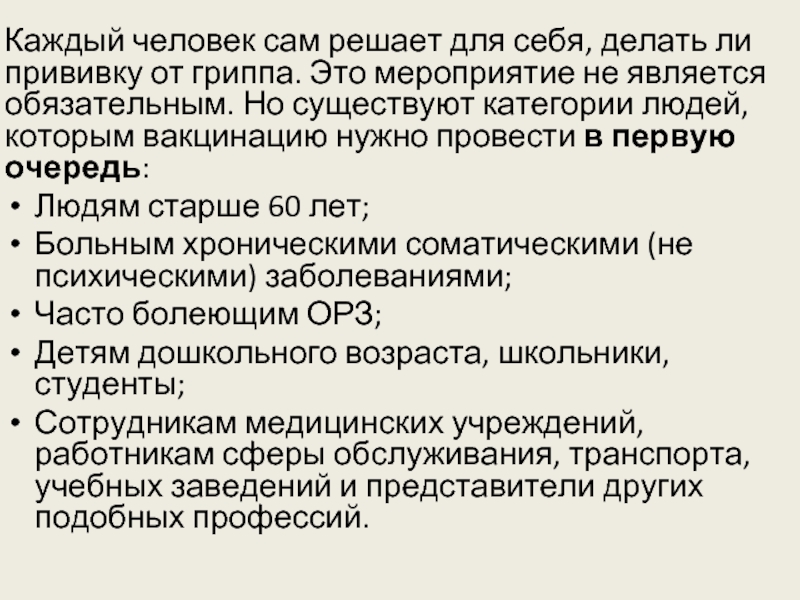 Каждый человек сам решает для себя, делать ли прививку от гриппа. Это мероприятие не является обязательным. Но существуют категории людей, которым вакцинацию нужно провести в первую очередь: