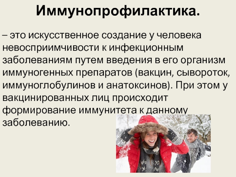– это искусственное создание у человека невосприимчивости к инфекционным заболеваниям путем введения в его организм иммуногенных препаратов (вакцин, сывороток, иммуноглобулинов и анатоксинов). При этом у вакцинированных лиц происходит формирование иммунитета к данному заболеванию.