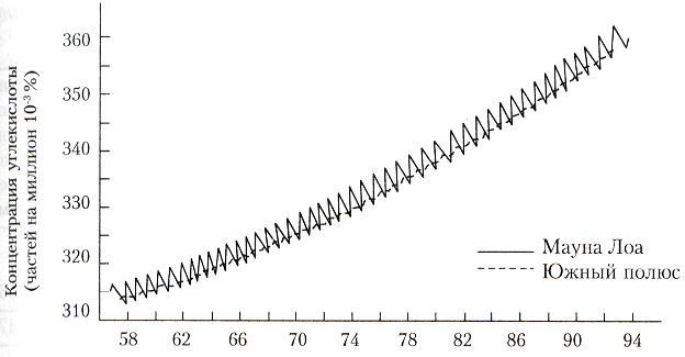Многолетние наблюдения на станции фонового мониторинга Мауна Лоа на Гавайских островах показали рост концентрации углекислого газа в атмосфере (рис. 21).