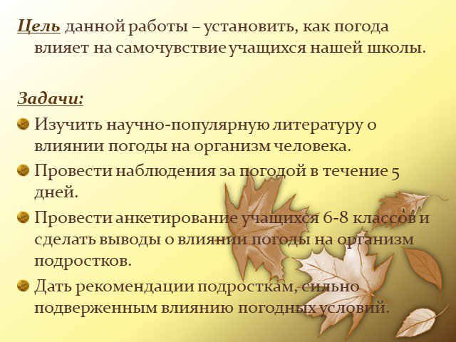 Цель данной работы – установить, как погода влияет на самочувствие учащихся нашей школы. Задачи: Изучить научно-популярную литературу о влиянии погоды на организм человека. Провести наблюдения за погодой в течение 5 дней. Провести анкетирование учащихся 6-8 классов и сделать выводы о влиянии погоды на организм подростков. Дать рекомендации подросткам, сильно подверженным влиянию погодных условий.