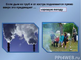 Наблюдения за достоверностью народных примет погоды Народная примета Погода В лесу много плодов рябины Осень будет дождливая Долго не улетают скворцы Осень будет сухая Муравьиные кучи осенью высокие Зима - суровая Белые облака зимой К морозу Зимой рано запели петухи К оттепели Зимою сильная тяга в печи К морозу Гром ранней весной К похолоданию Длинные сосульки К долгой весне Если из берёзы течёт много сока Лето будет дождливое Во время грозы долго слышатся раскаты грома Жди затяжного ненастья Летний туман ночью и утром К ненастью Лягушки громко квакают К дождю Зимой снег скрипит К морозу Собака кувыркается зимой по снегу К бурану Если сороки на дерево садятся К теплу Дым столбом К морозу Кошка лезет в тепло К морозу Ласточка низко летает над землёй К дождю Комары роятся Будет тепло