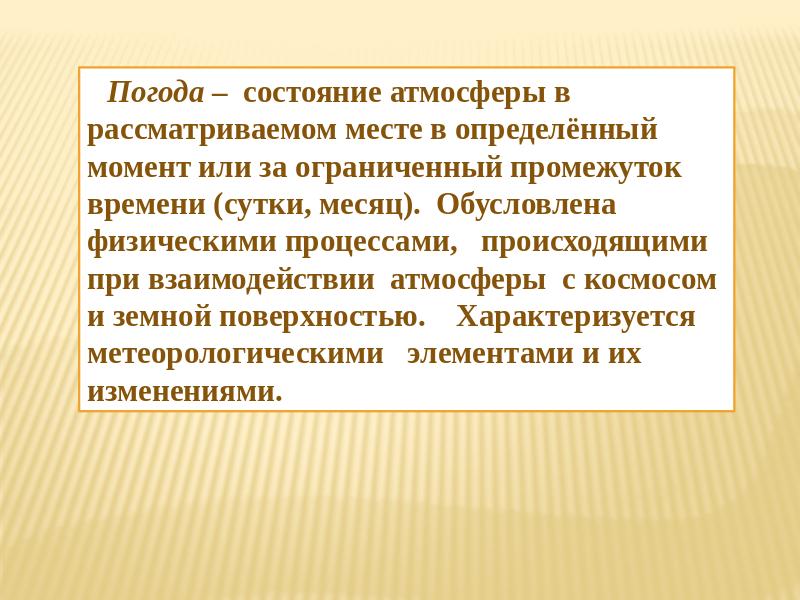 Погода – состояние атмосферы в рассматриваемом месте в определённый момент или за ограниченный промежуток времени (сутки, месяц). Обусловлена физическими процессами, происходящими при взаимодействии атмосферы с космосом и земной поверхностью. Характеризуется метеорологическими элементами и их изменениями.