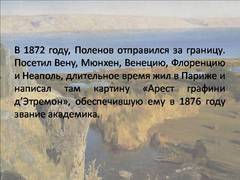 Слайд 9 В 1872 году, Поленов отправился за границу. Посетил Вену, Мюнхен, Венецию, Флоренцию и Неаполь, длительное время жил в Париже и написал там картину «Арест графини д’Этремон», обеспечившую ему в 1876 году звание академика.