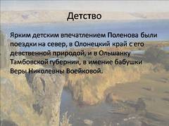 Слайд 3 Ярким детским впечатлением Поленова были поездки на север, в Олонецкий край с его девственной природой, и в Ольшанку Тамбовской губернии, в имение бабушки Веры НиколевныВоейковой.
