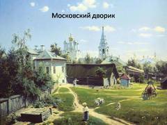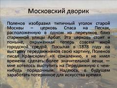 Слайд 13 Поленов изобразил типичный уголок старой Москвы – церковь Спаса на Песках, расположенную в одном из переулков близ старинной улицы Арбат. Эта церковь стоит и поныне, окруженная теперь совсем иной городской средой. Посылая в 1878 году на выставку передвижников свою картину, Поленов писал Крамскому: «К сожалению, я не имел времени сделать более значительной вещи — мне хотелось выступить на Передвижную с чем-нибудь порядочным. Надеюсь, в будущем заработать потерянное для искусства время».