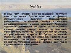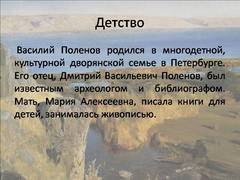 Посмотреть и скачать бесплатно презентацию по теме "Василий Дмитриевич Поленов", состоящую из 22 слайдов. Размер файла 1.82 Мб. Средняя оценка: 3.5 балла из 5. Каталог презентаций, школьных уроков, студентов, а также для детей и их родителей.