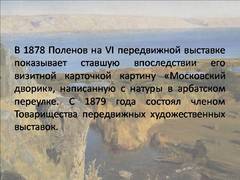 Слайд 11 В 1878 Поленов на VI передвижной выставке показывает ставшую впоследствии его визитной карточкой картину «Московский дворик», написанную с натуры в арбатском переулке. С 1879 года состоял членом Товарищества передвижных художественных выставок.