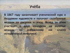 Слайд 5 В 1867 году заканчивает ученический курс в Академии художеств и получает серебряные медали за рисунки и этюд. Вслед за этим участвует в двух конкурсах на золотые медали по избранному им классу исторической живописи.