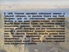 Слайд 14 В 1890 Поленов приобрёл небольшое имение в Тульской губернии, на высоком берегу над Окой. Построил дом по собственному оригинальному проекту, и при доме художественные мастерские. Усадьба была названа Борок. Там Поленов много и продуктивно работал, охотно приглашал к себе сельских детей, проводил для них познавательные занятия и представления, развивал художественный вкус. По замыслу Поленова, усадьба должна была стать «гнездом художников», а со временем превратиться в первый провинциальный общедоступный музей. Поленов построил народный театр для крестьян и церковь.