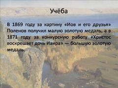 Слайд 6 В 1869 году за картину «Иов и его друзья» Поленов получил малую золотую медаль, а в 1871 году за конкурсную работу «Христос воскрешает дочь Иаира» — большую золотую медаль.
