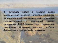 Слайд 15 В настоящее время в усадьбе Борок (современное название Поленово) находится Государственный мемориальный историко-художественный и природный музей-заповедник В.Д.Поленова, где сохранилась уникальная обстановка, интерьер, мебель, библиотека и предметы быта хозяина.