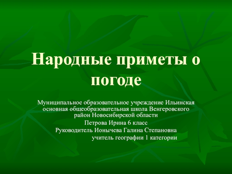 Презентационная работа по географии, призванная рассказать школьникам о том, что такое погода, какие факторы оказывают влияние на ее формирование, а также о современных и традиционных методах предсказания погоды.