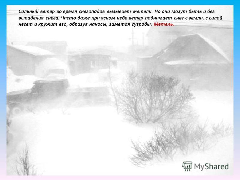 Метель Метель выпадение снега при сильном ветре. Сухой, пушистый снег легко переносится ветром. Бывает, что и без снегопада сильный ветер поднимает тучи снежинок с земли, закружит, и не поймешь, то ли снег сверху, то ли с земли. Если разыгралась сильная метель да пошел снег и ветер такой, что на улицу не выйдешь, то это уже настоящая снежная буря. В разных местах ее называют по-разному: буран, пурга. Сквозь снежную пелену днем, как в густом тумане, ничего не видно. Такое «помутнение» воздуха от снежинок называют снежной мглой.