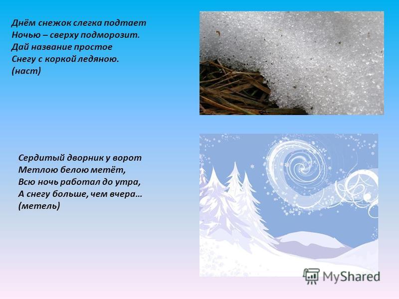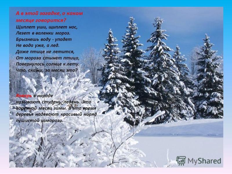 А в этой загадке, о каком месяце говорится? Щиплет уши, щиплет нос, Лезет в валенки мороз. Брызнешь воду - упадет Не вода уже, а лед. Даже птице не лечится, От мороза стынет птица, Повернулось солнце к лету. Что, скажи, за месяц это? Январь в народе называют студень, ледень. Это коренной месяц зимы. В это время деревья надевают красивый наряд пушистой изморози.