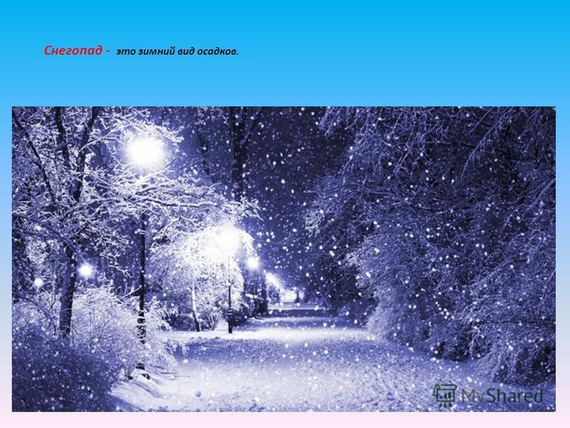 Снег – это зимние осадки. Зимой они плотным покрывалом покрывают все вокруг, создавая своеобразный микроклимат, помогающий растениям и мелким животным пережить суровые холода. Чем ниже температура воздуха, тем рыхлее становится снежный настил, он жестче хрустит под ногами и колется при прикосновении к нему.