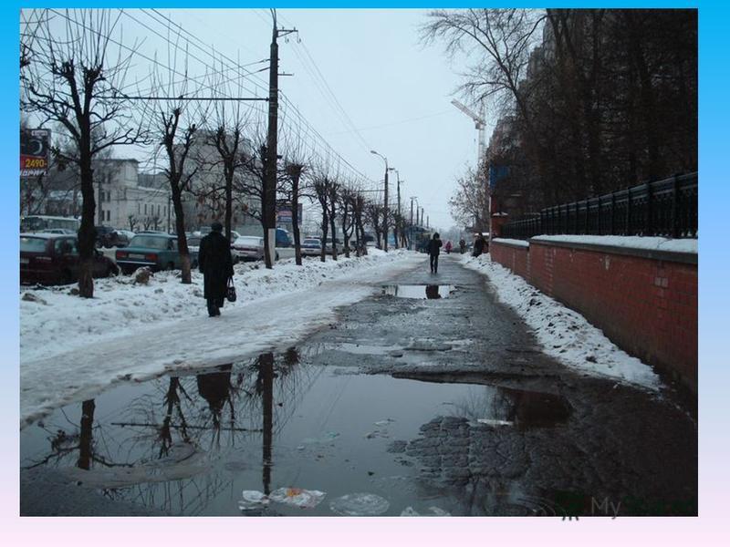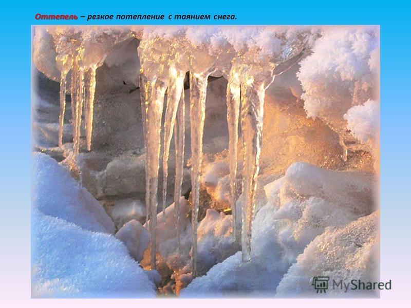 Наст. В конце февраля начале марта бывают предвесенние оттепели. Днем на крышах и деревьях тает снег, начинается капель. Ночью, когда подмораживает, образуются сосульки. Снег тает, уплотняется, теряет свою белизну. Если после оттепели похолодает, на нем образуется твердая ледяная корка наст.