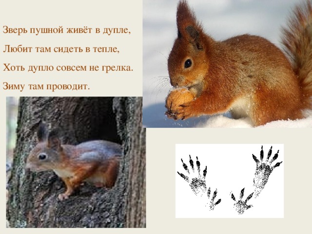 Зверь пушной живёт в дупле, Любит там сидеть в тепле, Хоть дупло совсем не грелка. Зиму там проводит.