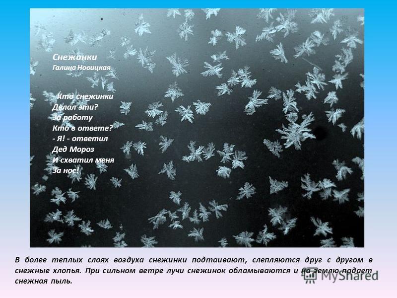 В более теплых слоях воздуха снежинки подтаивают, слепляются друг с другом в снежные хлопья. При сильном ветре лучи снежинок обламываются и на землю падает снежная пыль. Снежинки Галина Новицкая - Кто снежинки Делал эти? За работу Кто в ответе? - Я! - ответил Дед Мороз И схватил меня За нос!