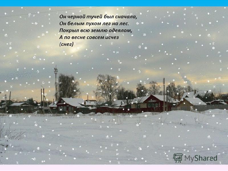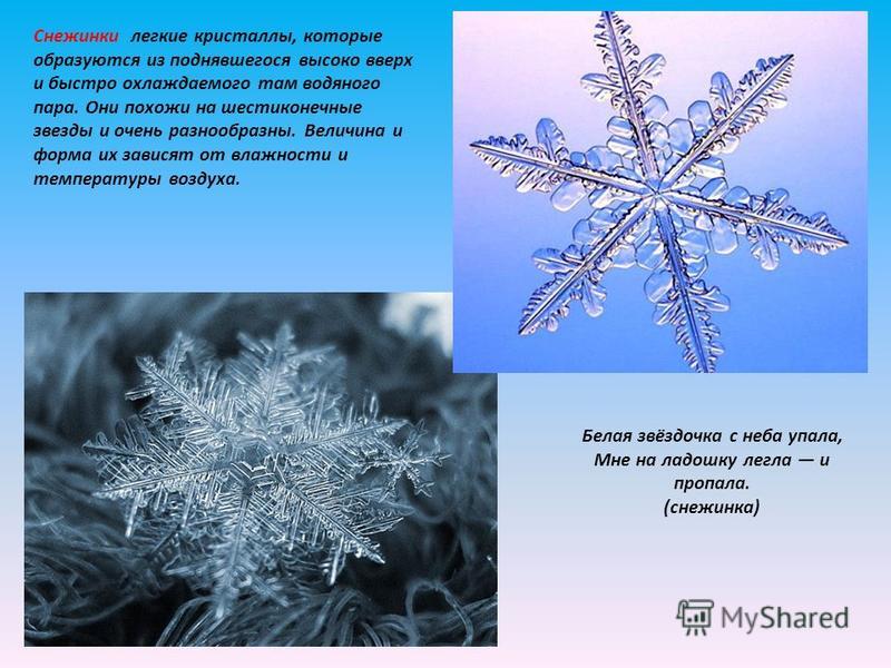 Снежинки легкие кристаллы, которые образуются из поднявшегося высоко вверх и быстро охлаждаемого там водяного пара. Они похожи на шестиконечные звезды и очень разнообразны. Величина и форма их зависят от влажности и температуры воздуха. Белая звёздочка с неба упала, Мне на ладошку легла и пропала. (снежинка)