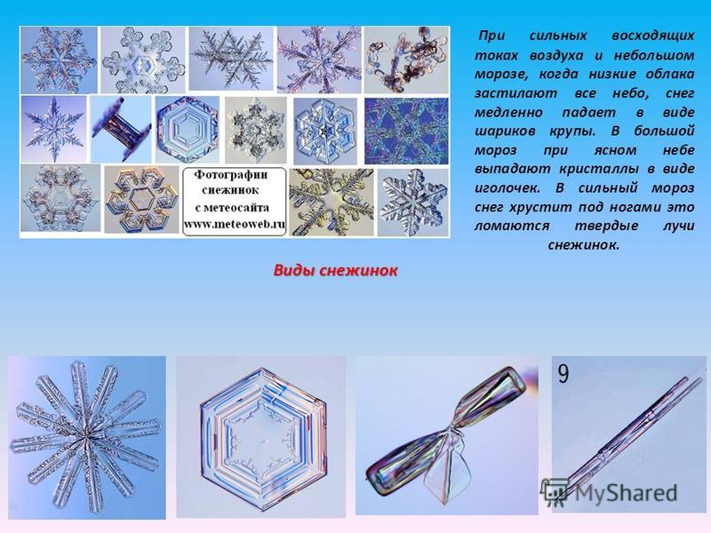 При сильных восходящих токах воздуха и небольшом морозе, когда низкие облака застилают все небо, снег медленно падает в виде шариков крупы. В большой мороз при ясном небе выпадают кристаллы в виде иголочек. В сильный мороз снег хрустит под ногами это ломаются твердые лучи снежинок. Виды снежинок