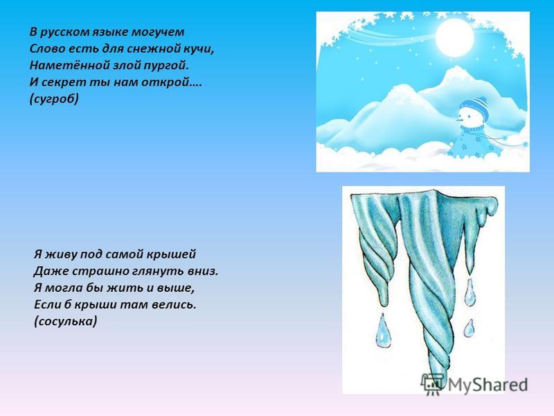 Сосулька Еще один непременный атрибут зимы – Сосулька – кусок льда конусообразной формы, который свисает с какой-либо плоскости. Днем солнце прогревает снег, он начинает таять и подтекать, а ночью мороз усиливается, все вокруг замерзает. Масса сосульки растет по мере таяния снега, потом она обрушивается от собственного веса и рассыпается от столкновения с землей. Выберите явления, характерные для неживой природы зимой. Снегопад, дождь, туман, снег, ледоход, метель, половодье, иней, изморозь, сугробы, роса, гроза, гололедица, молния, вьюга. ….Вихри снежные крутя: То, как зверь она завоет. То заплачет, как дитя… (Февраль) Выполним упражнение, которое поможет вам ответить на вопрос. Упражнение с снежинками: сделали глубокий вдох и плавный длительный выдох на снежинки, губы в «трубочку». Что произошло с снежинками? Какое явление мы попытались изобразить? Зимняя викторина Послушайте стихотворение. О каком зимнем месяце говорится? Придет неслышными шагами, Незримой стужею дохнет И, все вокруг покрыв снегами, Вдруг всем нам уши надерет: Зачем, мол, вы в такой мороз Из дома высунули нос? (Январь.)