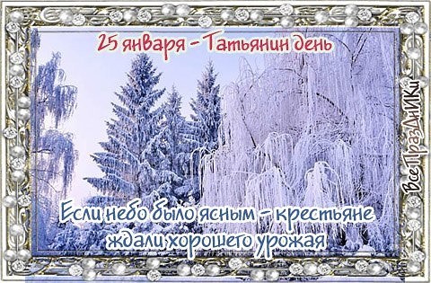 Накануне дня снятой мученицы Татианы 25 января принято было Бога о солнечном морозном утре молить, которое сулило ранний прилет птиц, теплое лето и богатый урожай. Да и празднику хорошая погода никогда не мешала, а на Руси его принято было справлять шумно и весело, от души поздравляя всех Татьян. Ведь только один раз упоминалось это имя в православных святцах, тогда как Иваны, например, свои именины могли десятки раз отмечать.
