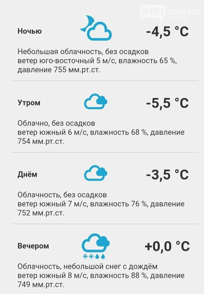 Облачно. Вечером ожидается небольшой снег с дождём. Температура - 0 - минус 3-5 градусов по Цельсию.