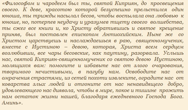 Эта дата на Руси считалась днем очищения от наваждений и избавления от злых духов. Если не прочитать соответствующую молитву, на человека могли напасть бесы. Причем, как правило, мужчины молились Куприяну (Киприану), а женщины — Устинье (Иустине).