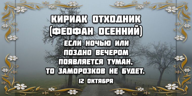 13 октября. В прежние времена, по примете, нужно было сжечь соломенную постель, чтобы избавиться от хворей и несчастий. Еще одно поверье гласит, что в этот день на пороге дитя искупать — от болезней и сглаза его защитить. Снегири раскричались — быть зиме скоро. Туман в этот день сулит много оттепелей за зиму.