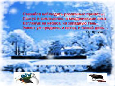 Старайся наблюдать различные приметы; Пастух и земледелец, в младенческие лета, Взглянув на небеса, на западную тень, Умеют уж предречь и ветер, и ясный день… А.С. Пушкин