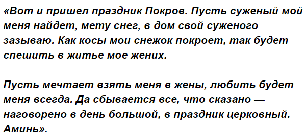 Касаемо еще одной важной приметы на Покров Пресвятой Богоматери говорилось выше: не рекомендуется отказывать сватам, иначе свадьбы девушке ждать три года. В случае, когда жених девушке совсем уж не по душе, но свадьбы долго ждать не хочется, лучше вовсе не пускать нежеланных сватов в дом, сделав вид, что он пуст.
