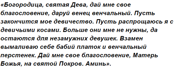 Свадебные приметы на Покров день, 14 октября, особо почитались холостыми парнями и девушками. Девчата, мечтающие как можно скорее выйти замуж, с утра пораньше шли в церковь и ставили праздничную большую свечу. Если верить примете, чем раньше поставишь свечу, тем быстрее всех подружек выйдешь замуж. Только перед тем, как пойти в церковь, необходимо было заплести косу на голове и ни в коем случае не расплетать её целый день. Перед сном разрешалось это сделать. Выходя из дома, обязательно нужно было повязать на голову платок или косынку, а из одежды предпочитались платья.