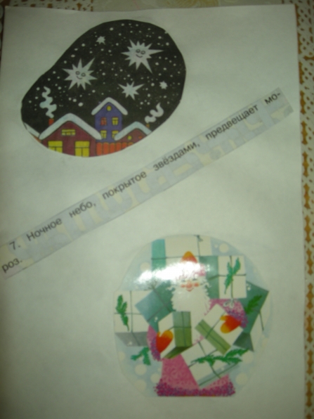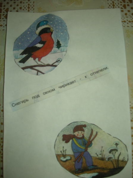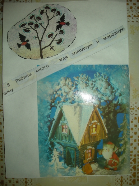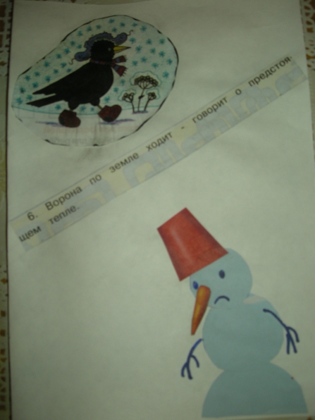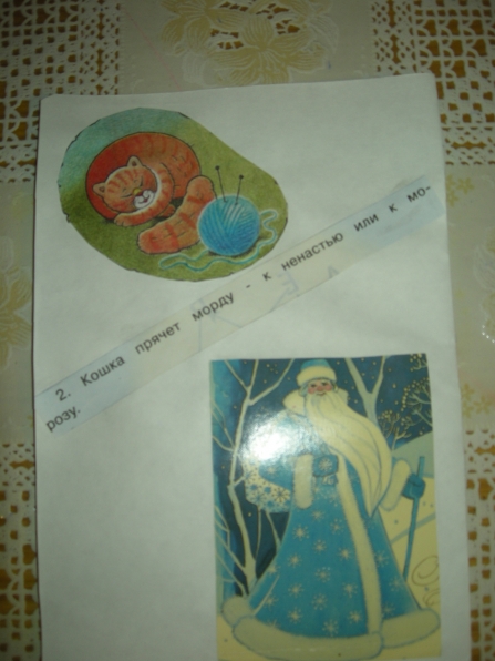 Мне очень понравилась идея Ирины Коваленко «Пословицы и поговорки» в картинках. И вот недавно у меня то же возникла идея на подобии Ирининой. А именно. В настоящее время, мы с детьми старшей группы, много говорим о приметах зимы. Дети учатся замечать, делятся своими наблюдениями, хотят узнать всё новые и новые приметы. А я решила им немного помочь. Подобрала соответствующие картинки (помогла детская газета «Солнецный зайчик», старые открытки) обсудили с детьми, что они означают. Вот, что у нас получилось: