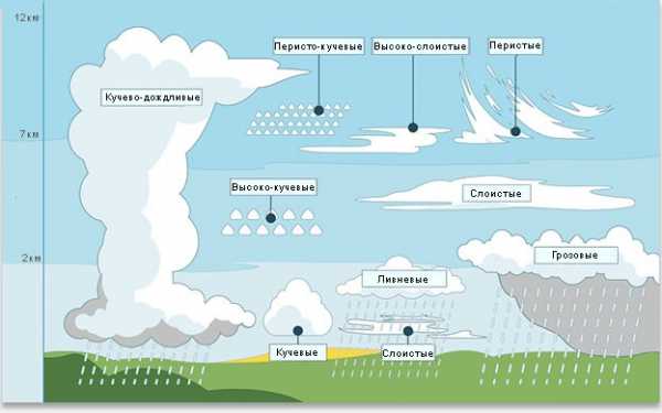 Всемирная классификация облаков выделяет множество видов, каждый из которых обладает своим латинским названием. В ней учитывается форма, происхождение, высота образования и ряд других факторов. Основу классификации составляют несколько видов облаков: