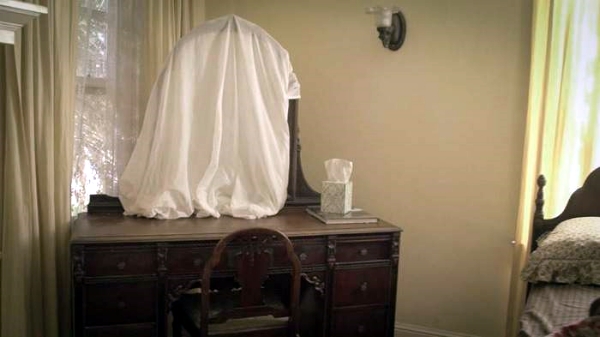 Многие люди придерживаются такого правила: до тех пор, пока усопший находится в доме, нужно обязательно укрывать поверхности, которые способны что-либо отражать, например, зеркала, телевизор. Данное суеверие не имеет ничего общего с православными убеждениями, а относится к язычеству. Считается, что после смерти душа человека может быть затянута в зеркало и не в состоянии выйти оттуда, будет вечно скитаться, так и не найдя себе упокоения. После того, как покойного выносят из помещения, полотна можно снимать, но некоторые выдерживают их закрытыми в течение 9 и даже 40 дней.