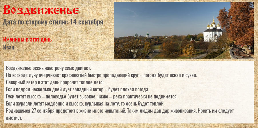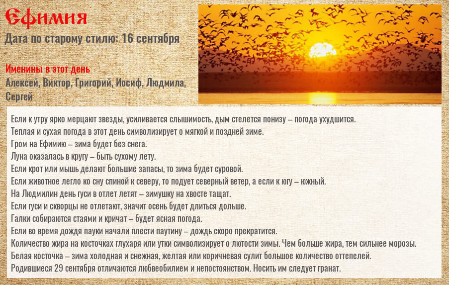 Если в этот день был гром, то это предвещало теплую и длинную осень, а также зимушку богатую на снег. В эти сутки часто бывают первые сильные осенние заморозки. Наблюдали за журавликами.